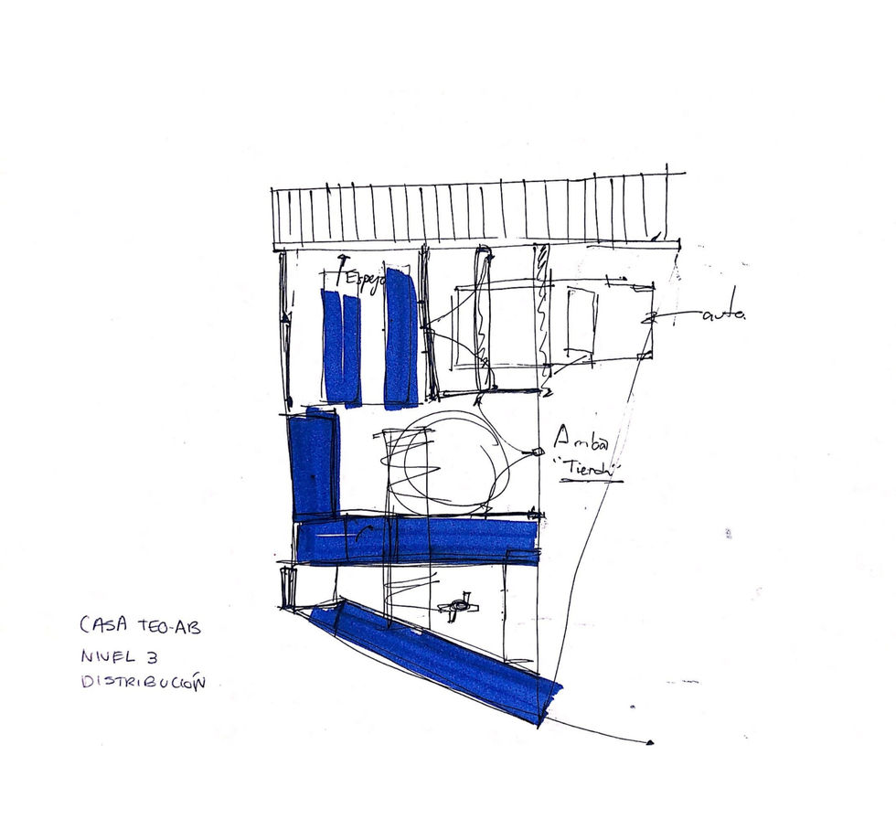 La calle principal se encuentra alineado al tercer nivel, en la que circulan los coches y habitantes que se dirigen al centro de la población. Se requiere conectar el nivel de calle con el nivel 1 del edificio, ya que, de acuerdo a la cultura local, los ciudadanos recurren a la tienda de los propietarios de dicho proyecto de forma recurrente por ser céntrica, pero se requiere cambiar a un edificio propio y no seguir rentando un local. El acceso al primer nivel puede ser por las escaleras principales del lado norte, que conecta también con el patio principal y cocina compartida existente. Pero para ingresar a las duchas el reto consiste en colocar una escalera interna que impida la vista a los deportistas u ocupantes de las duchas hacia el patio y espacios privados del edificio. Ya en la construcción, en el muro de contención del primer nivel se tuvo que levantar mampostería de 80 cm con columnas de 40cm por lado, reforzadas con acero de acuerdo al cálculo realizado. También para evitar filtraciones se aplicaron ebulliciones asfálticas, reforzando el los lados de empuje con muros de piedra. La escalera principal forma parte del proyecto, y se pretende tener un descanso en cada puerta debido a la pendiente prolongada, además de que se cuenta con veredas alternas como tipo rampa para llegar al 3 nivel o nivel de calle. Esta primera parte en obra refiere específicamente al primer nivel, pero en diseño y proyección abarca los 4 niveles. El proyecto está orientado al Noroeste, debido a la única vista que se tiene, ya que el norte y sur están compuesto por edificios superando los 3 niveles. Casa U Teo-ab es un proyecto para una pareja con 3 hijos que vive a una cuadra del predio a diseñar. Se encuentra en Santa María Yacochi, Oaxaca. En un clima frío, con lluvias constantes. Proyectado para 4 niveles con 45.60 m2 cada uno de uso comercial. El proyecto se caracterizará por darle énfasis al material utilizado que es el ladrillo rojo recocido. Actualmente el entorno es de edificios en colores no propios de la zona, monumentales y bruscos. Se quiere resaltar en cuanto a edificio, pero sin salir de la tipología de materiales usados y forma. De forma contextual se requiere conectar la calle del nivel 3 con el 1. Este proyecto contempla tener en un primer nivel una habitación y duchas para visitantes. Para el segundo nivel se requiere un comedor y su cocina. El tercer nivel abarcaría una tienda de abarrotes, ésta conectada al nivel de carretera en el lado Este. En casa U Teo-ab se comprometió con grandes ideas dentro de una modesta huella y presupuesto con el fin de mejorar la calidad de la experiencia cotidiana para la familia que la habita. Para esta primera etapa de obra se proyecta una habitación que servirá para renta o para uso temporal en caso de tener labores hasta muy tarde por parte de los propietarios. Y una parte está contemplado para tercer 4 duchas para uso comercial. Esto por las fiestas patronales de dicha comunidad, además de que la comunidad es un punto central de la región, y por qué el lote se encuentra en el centro del pueblo.